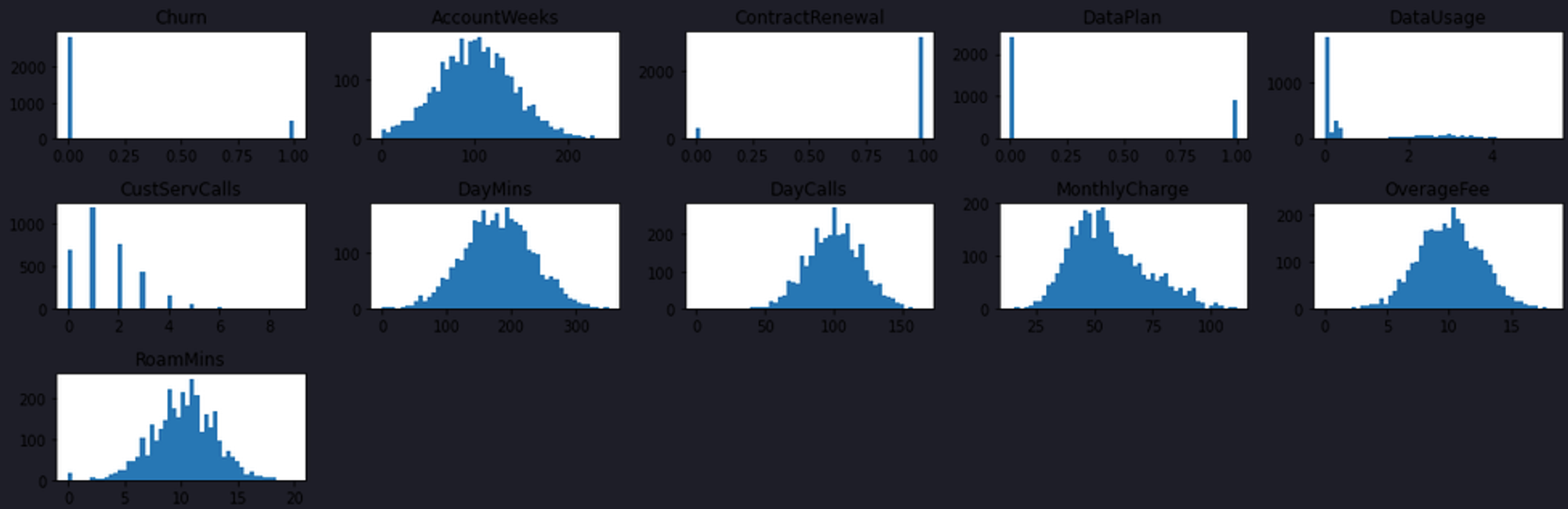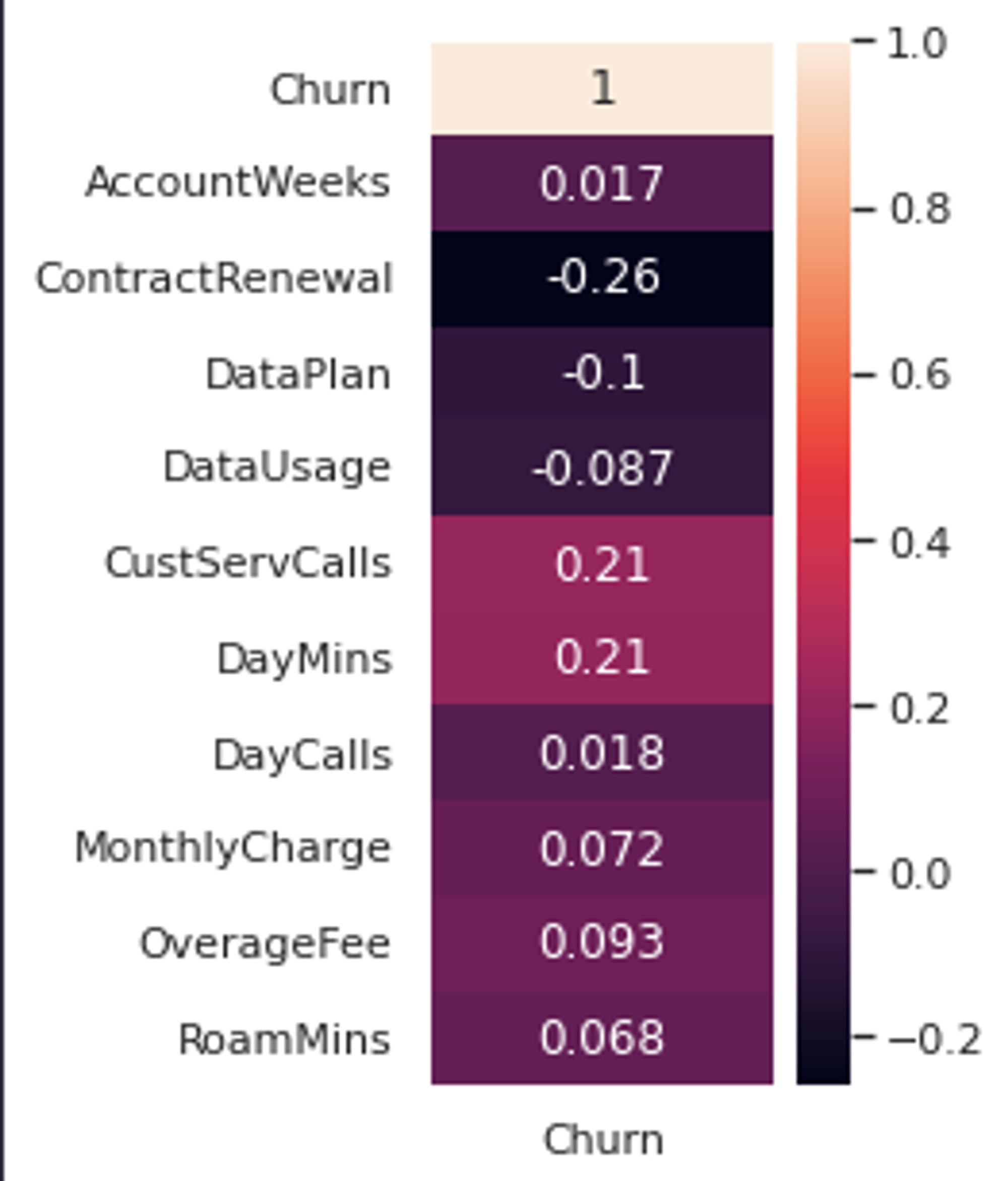 As per the above image, features CustServCalls, DayMins, and ContractRenewal represent the strongest correlation which means these variables might be important for our model.
