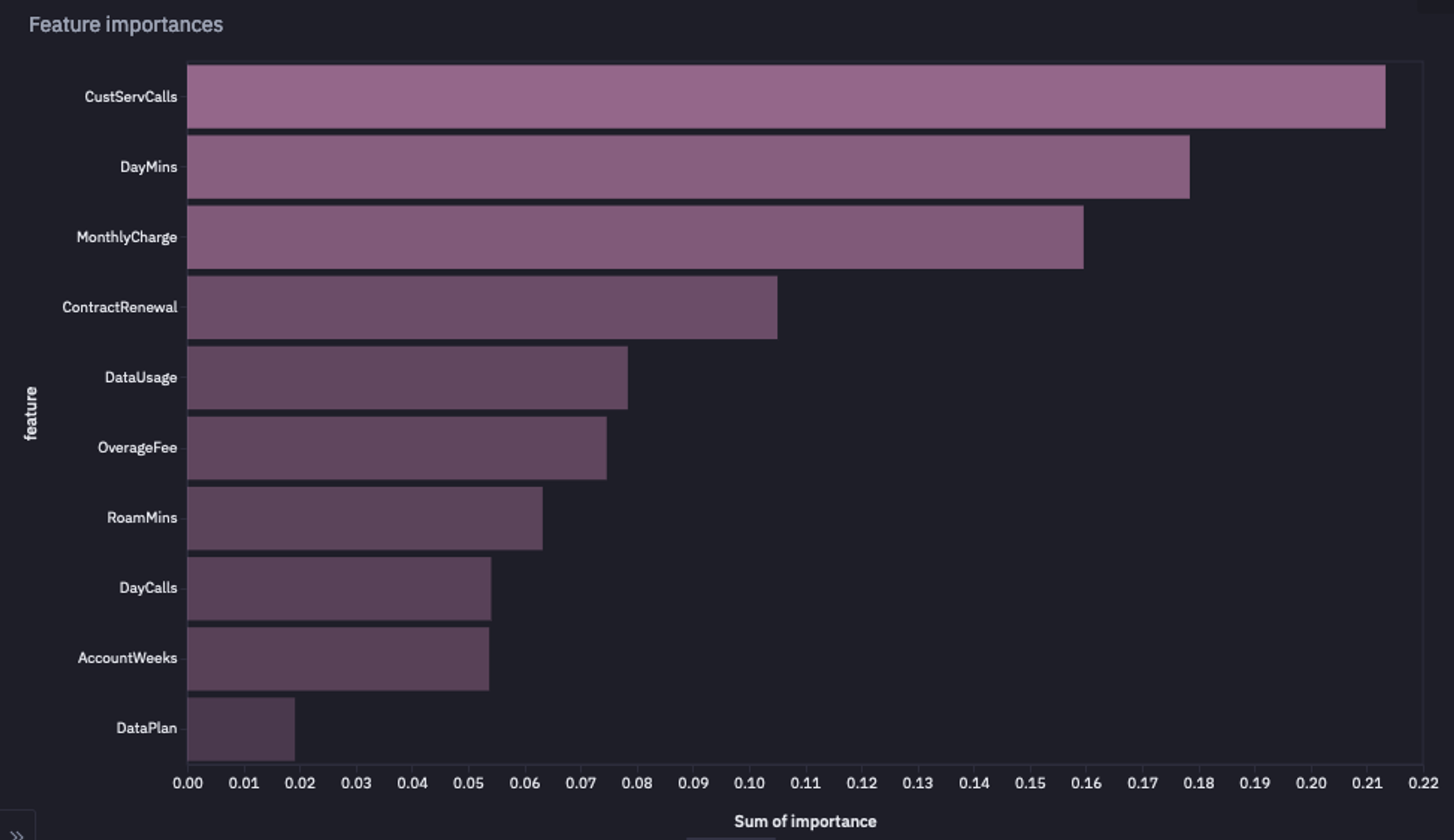 As you can see, CustServCalls, DayMins, and MonthlyCharge are the most important features for our churn analysis.