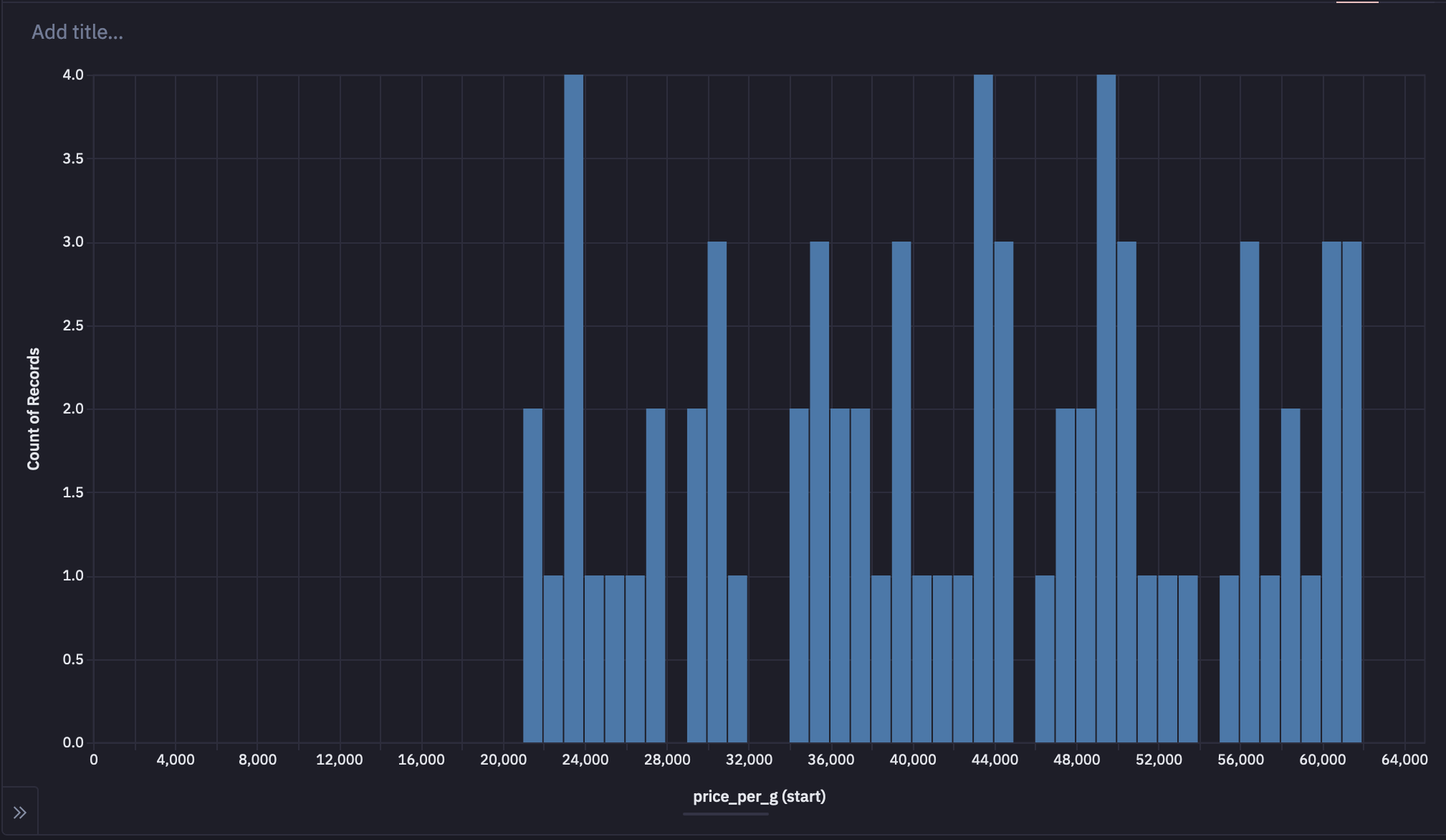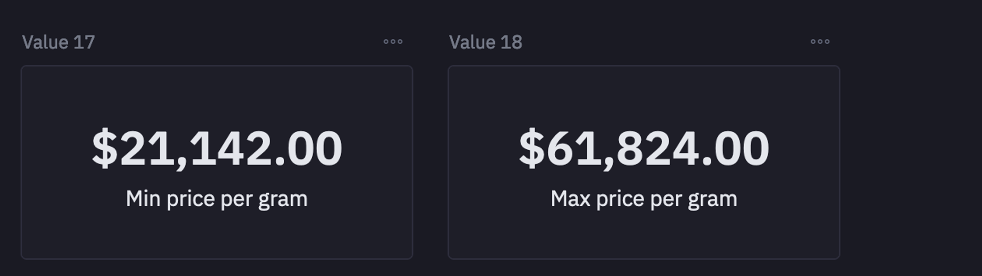 To check the minimum and maximum price per gram values, you can now use the Python cell.