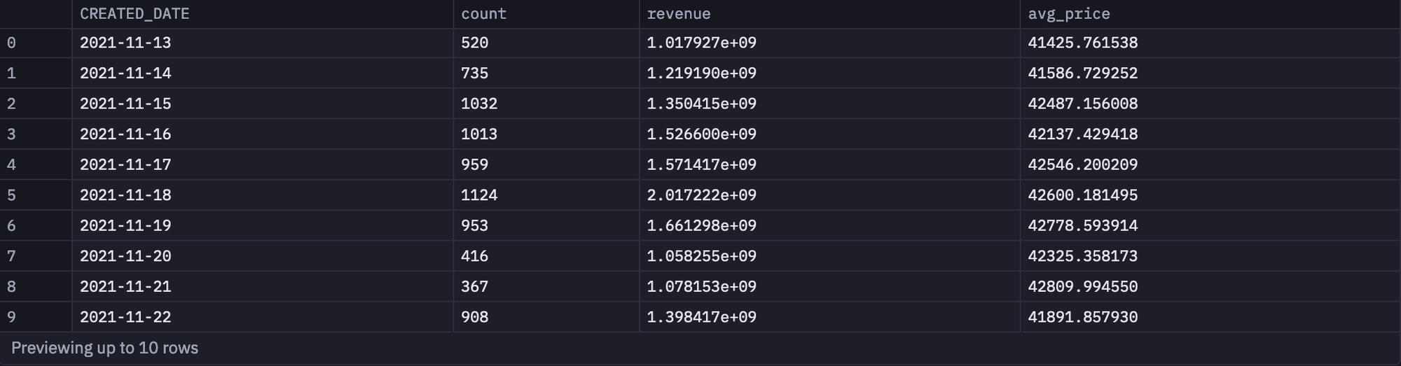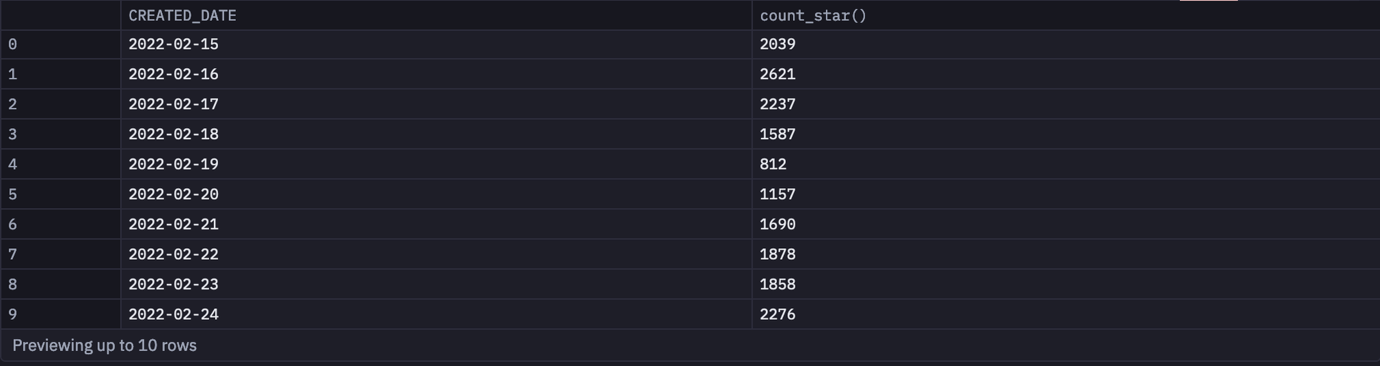 select CREATED_DATE, COUNT(*) from spice_purchases GROUP BY 1