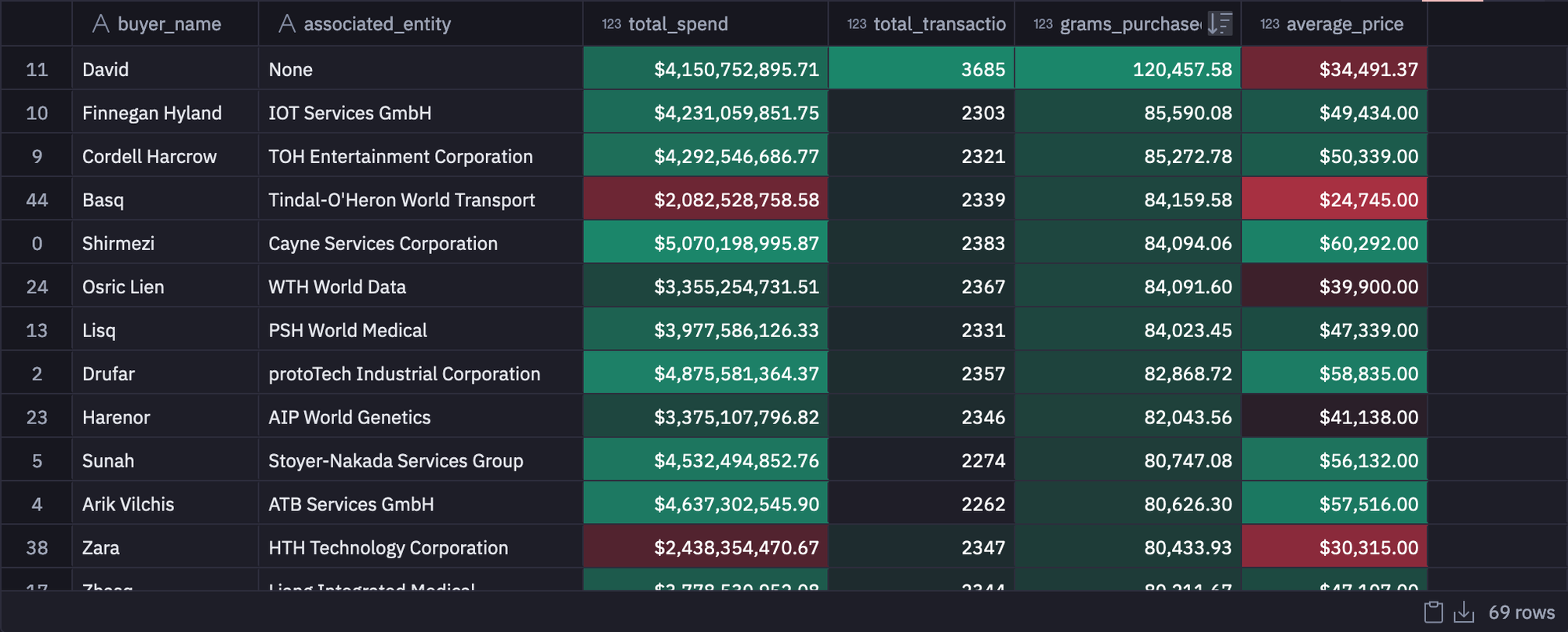 The main query then selects the buyer_name from this baseline data and calculates three key metrics.
