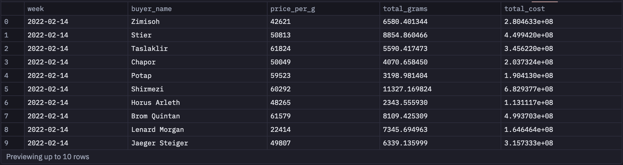 This code snippet is uses the melt function from pandas to reshape buyers_prices. In this case, it converts the DataFrame from a wide format to a long format. The id_vars parameter specifies the columns to be retained as-is (CREATED_DATE and buyer_name).