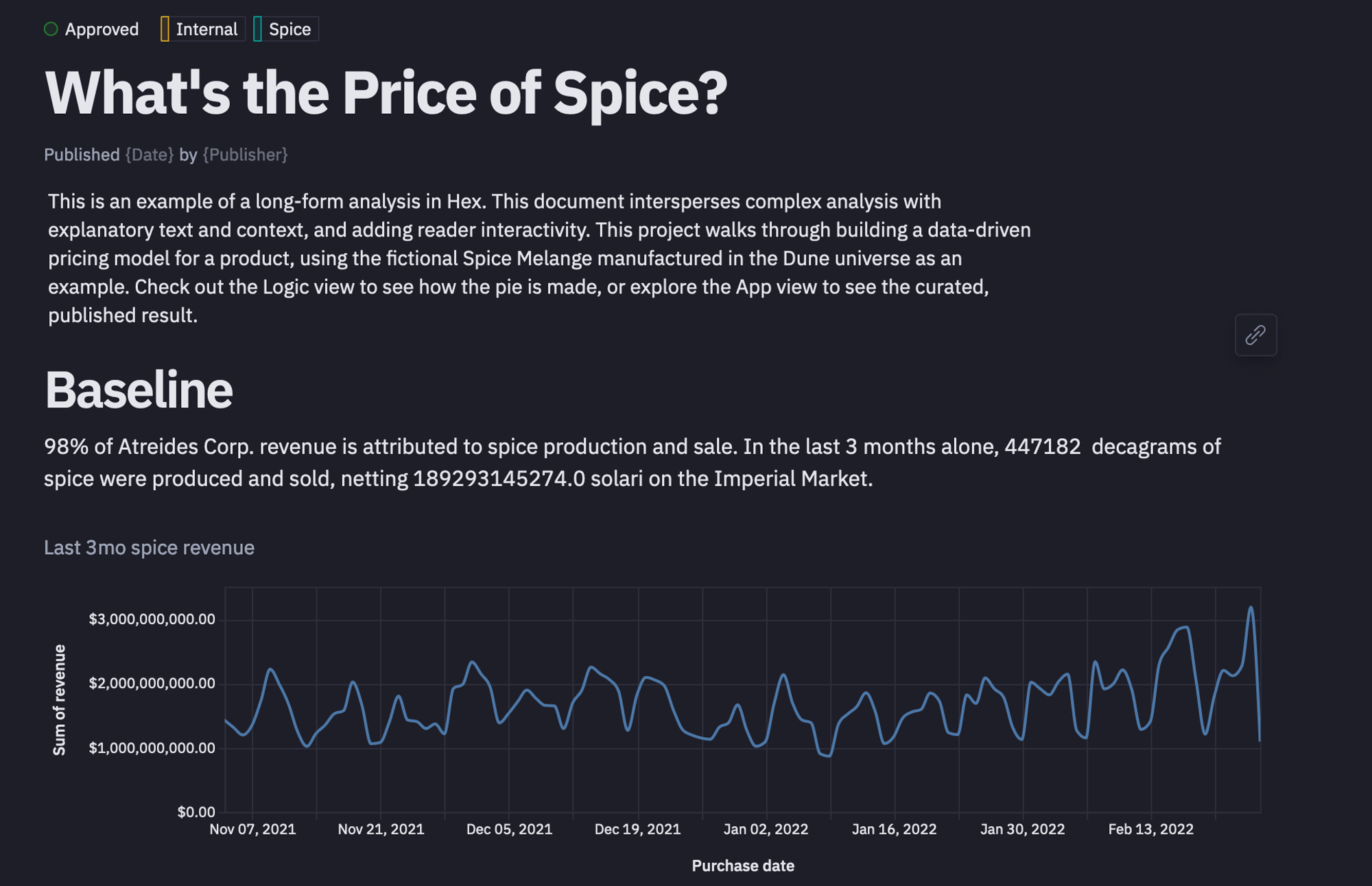 This section will teach you to build an interactive data story dashboard with Python and Hex. You will be building a data-driven pricing model for a product, using the fictional Spice Melange manufactured in the Dune universe as an example. We have named this example as What is the Price of Spice?. By the end of this section, you will learn to turn complex analysis into long-form analytical documents or whitepapers, complete with end-user interactivity with the help of Hex.