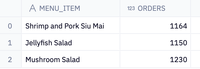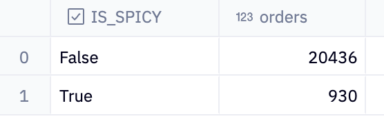 This will produce a tale with two columns: is_spicy and orders. It shows the total number of orders for each category of spiciness (spicy or not spicy) within the 'Dumplings' category. This is useful for analyzing how the spiciness of dumplings affects order volume and can help us understand if spicy dumplings are more popular than non-spicy ones.