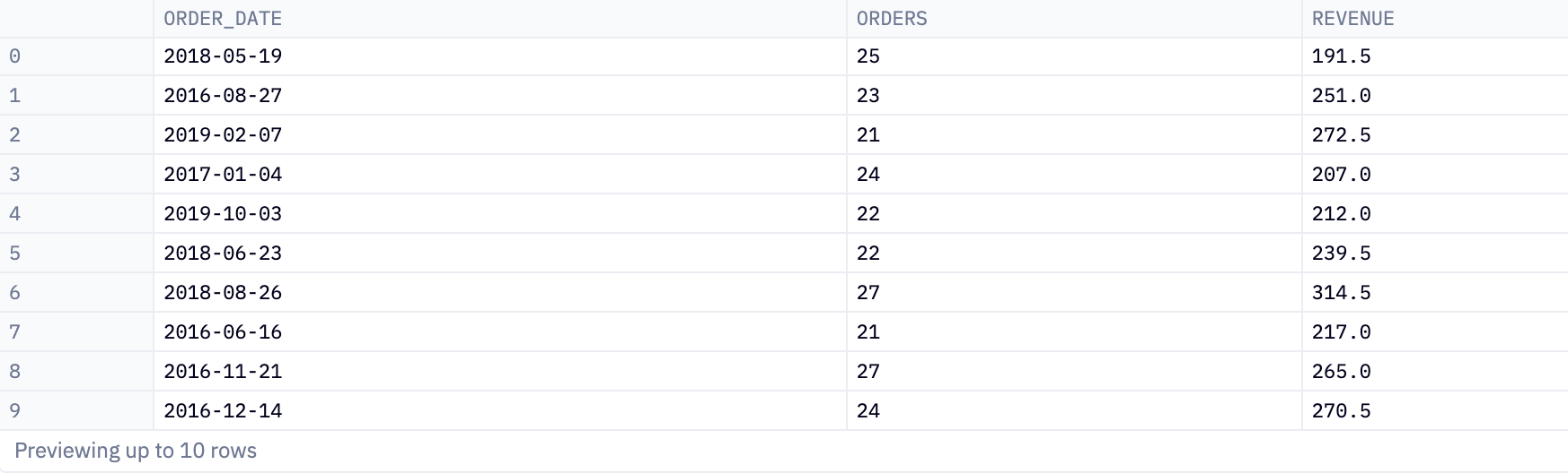 This produces three columns, order_date, orders, and revenue. For each unique date in the dim_orders table, we get the total number of orders placed and the total revenue generated from those orders.