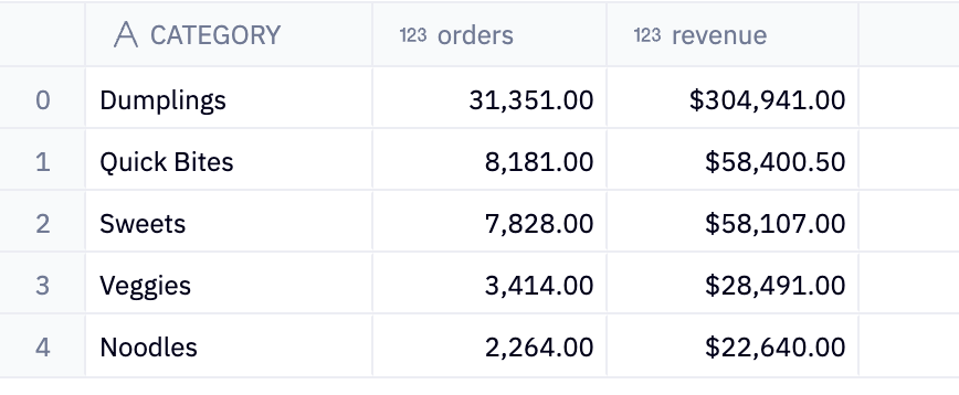 This code again retrieves and summarizes data about dumplings, but there also collates the data on spiciness, using count(*) as ordersto count the total number of rows (or orders) for each value in the is_spicy column within the specified category.