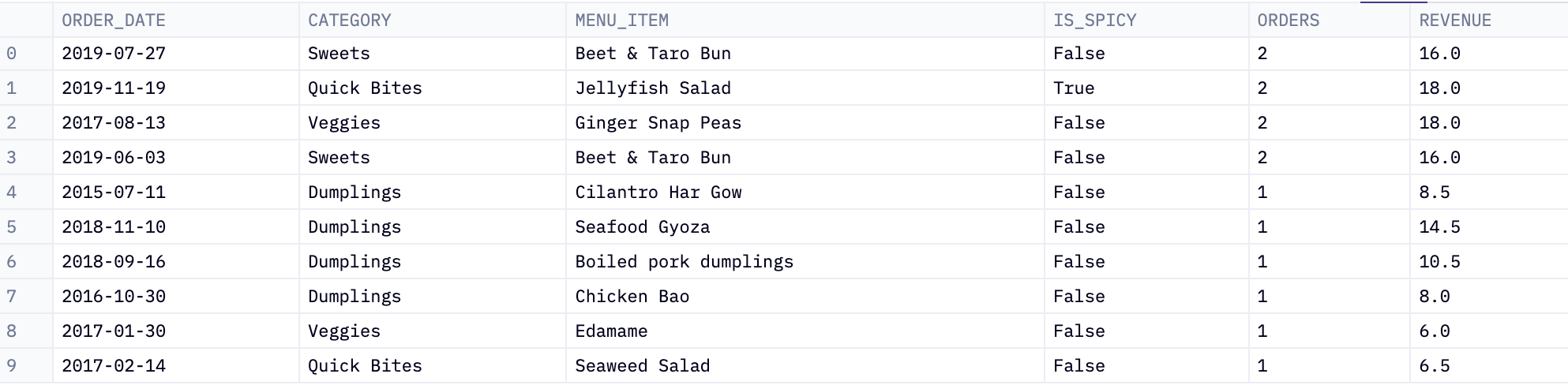 • count(*) as orders: This counts the total number of rows (or orders) for each unique combination of order_date, category, menu_item, and is_spicy. The result is labeled as orders.