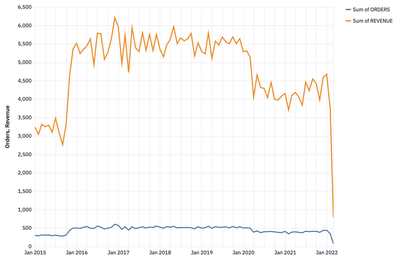 Next up, we’re going to plot some of this data. This would usually be a “gotcha” in SQL-only analysis, as SQL has no graphing capabilities. But when you use SQL in Hex notebooks, you can take advantage of Hex built-in charts. Here, we’re going to plot the orders and revenue over time: