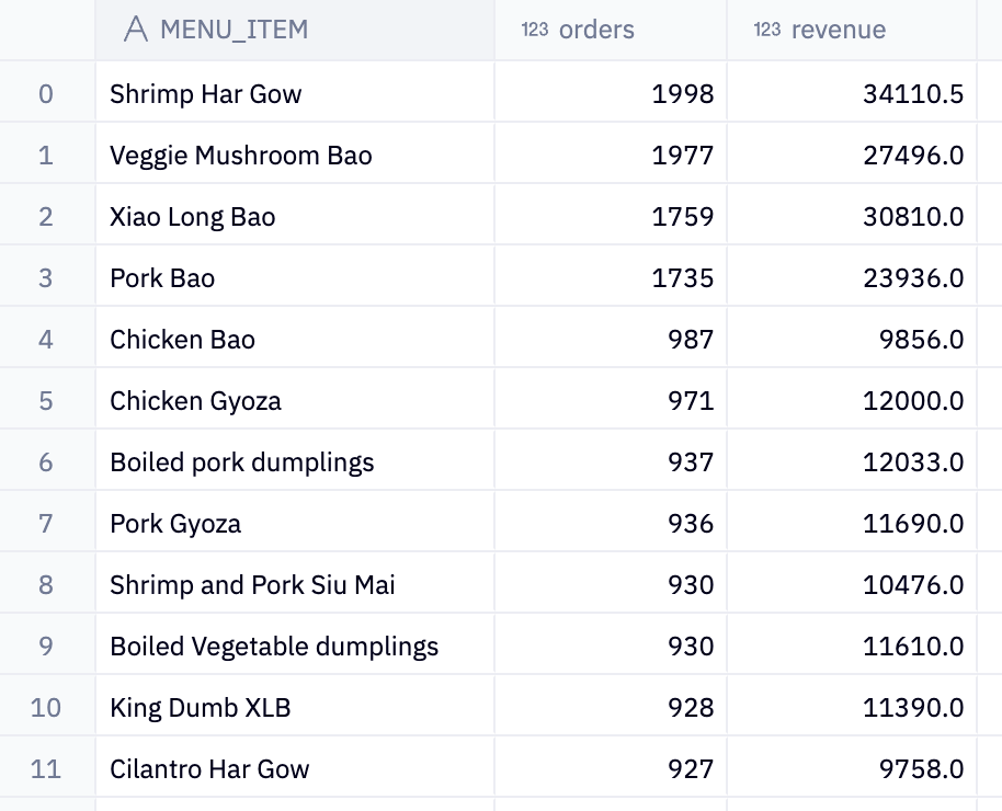 It shows the total number of orders and total revenue for each dumpling menu item, with the items sorted from the highest to the lowest number of orders. We can then see that Shrimp Har Gow, Veggie Mushroom Bao, Xiao Long Bao, Pork Bao, and Chicken Bao are the top 5 dumplings in the store by orders:
