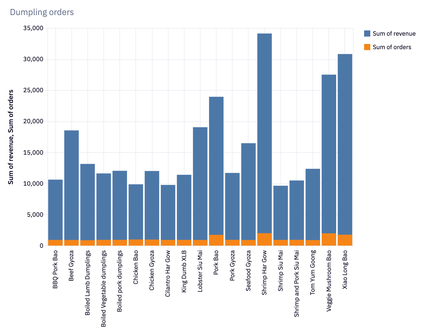 We can then also plot the revenue and orders from each of our dumplings to better understand which are performing well: