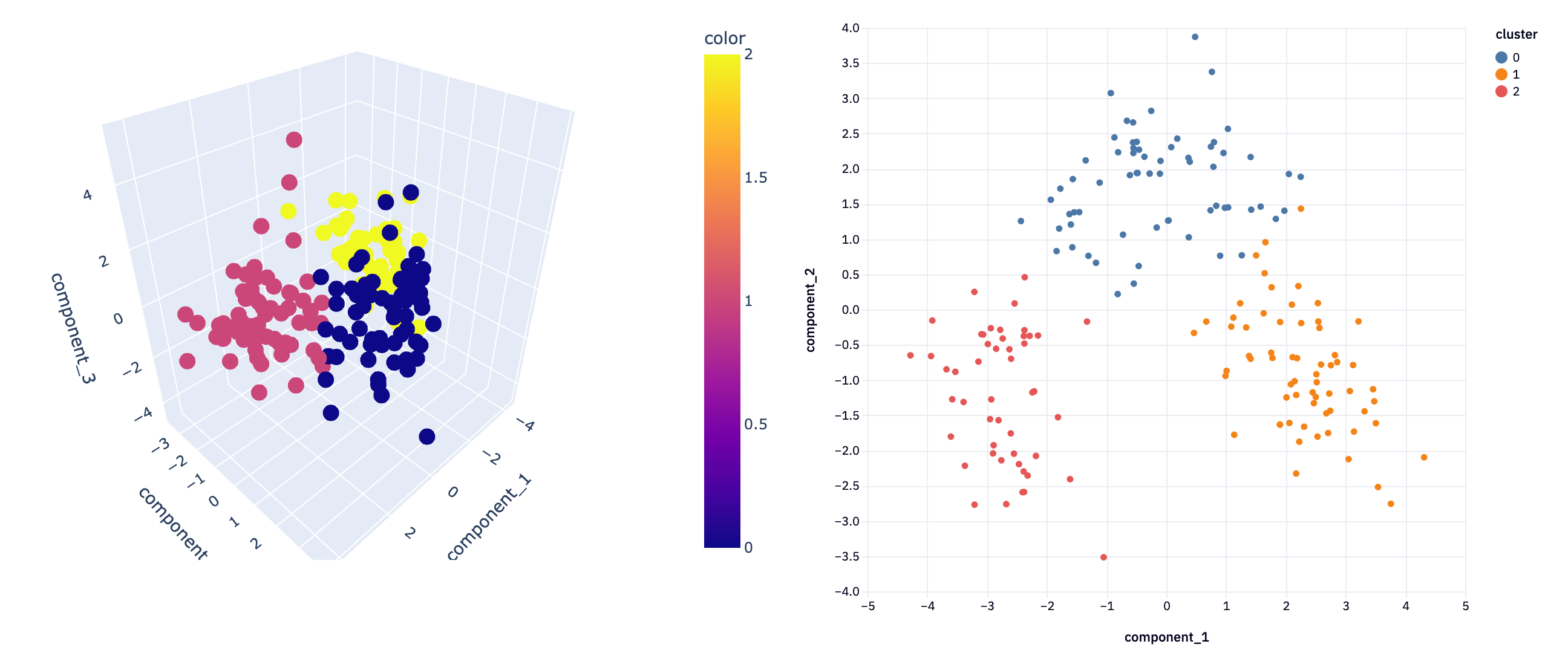 The core of the function uses Plotly Express, a plotting library known for its interactivity and aesthetically pleasing plots. The px.scatter_3d method is called to create a 3D scatter plot, with x, y, and z axes corresponding to the three components. The color of each data point is determined by the cluster parameter, allowing for easy visualization of how data points are grouped in clusters.