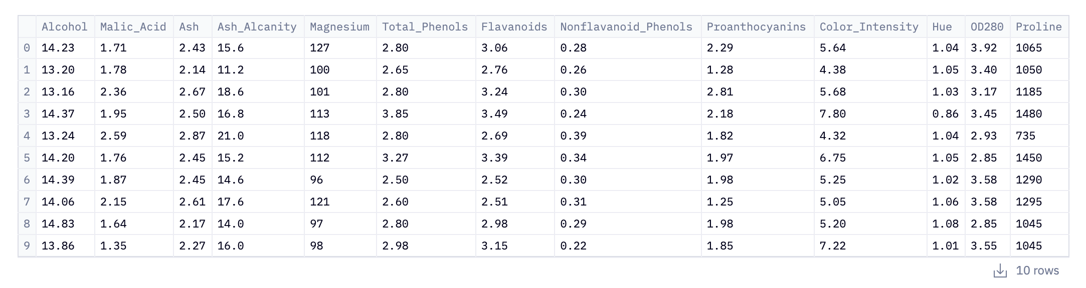 This initial step loads data into our Python environment using Pandas. Here, the pd.read_csv() function is used to read a CSV (Comma-Separated Values) file from the URL. This CSV file, named wine_data.csv, contains our data related to wine: alcohol content, phenols, color.