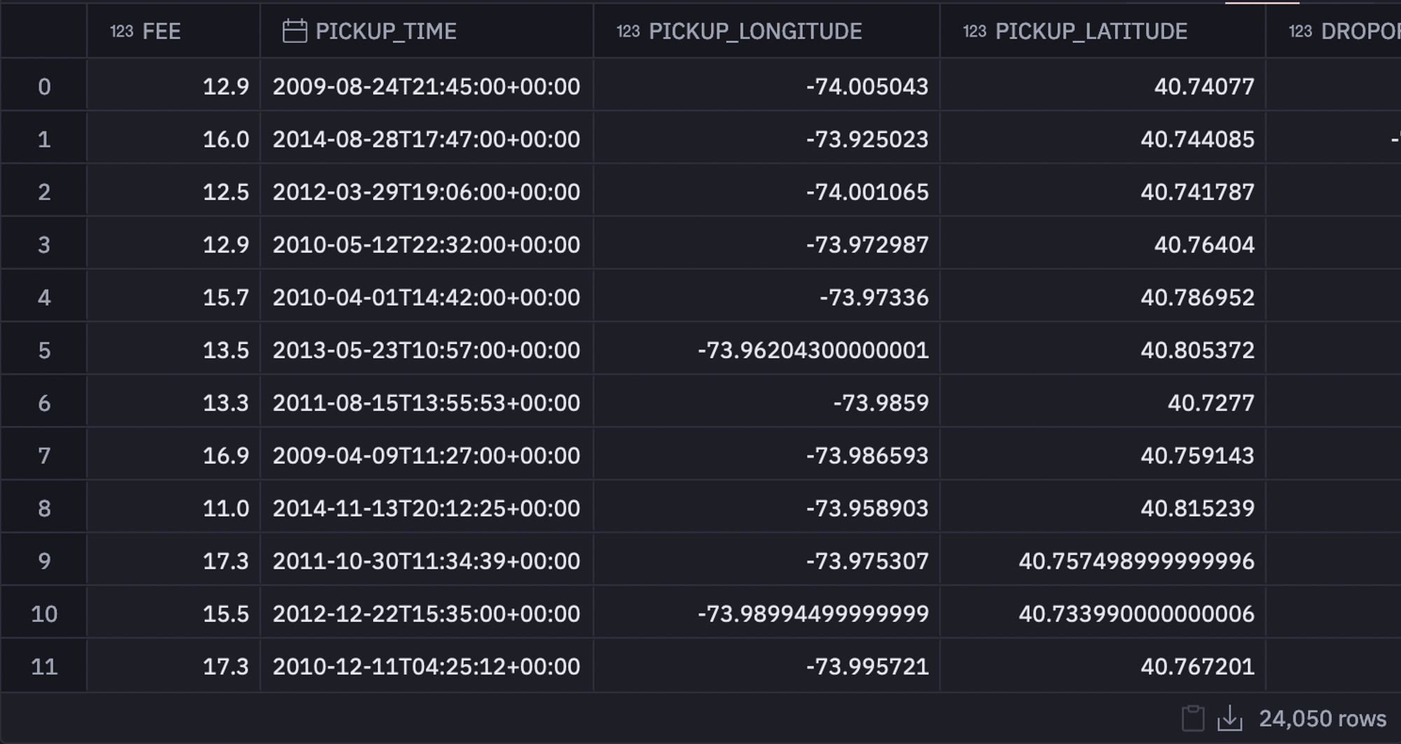 The next step is to load the dataset. The dataset that we are going to use is based on Uber rides in New York between 2009 and 2015. In our case, the data is patiently waiting in a Snowflake database and we can easily pull it into Hex with the use of a [SQL cell].