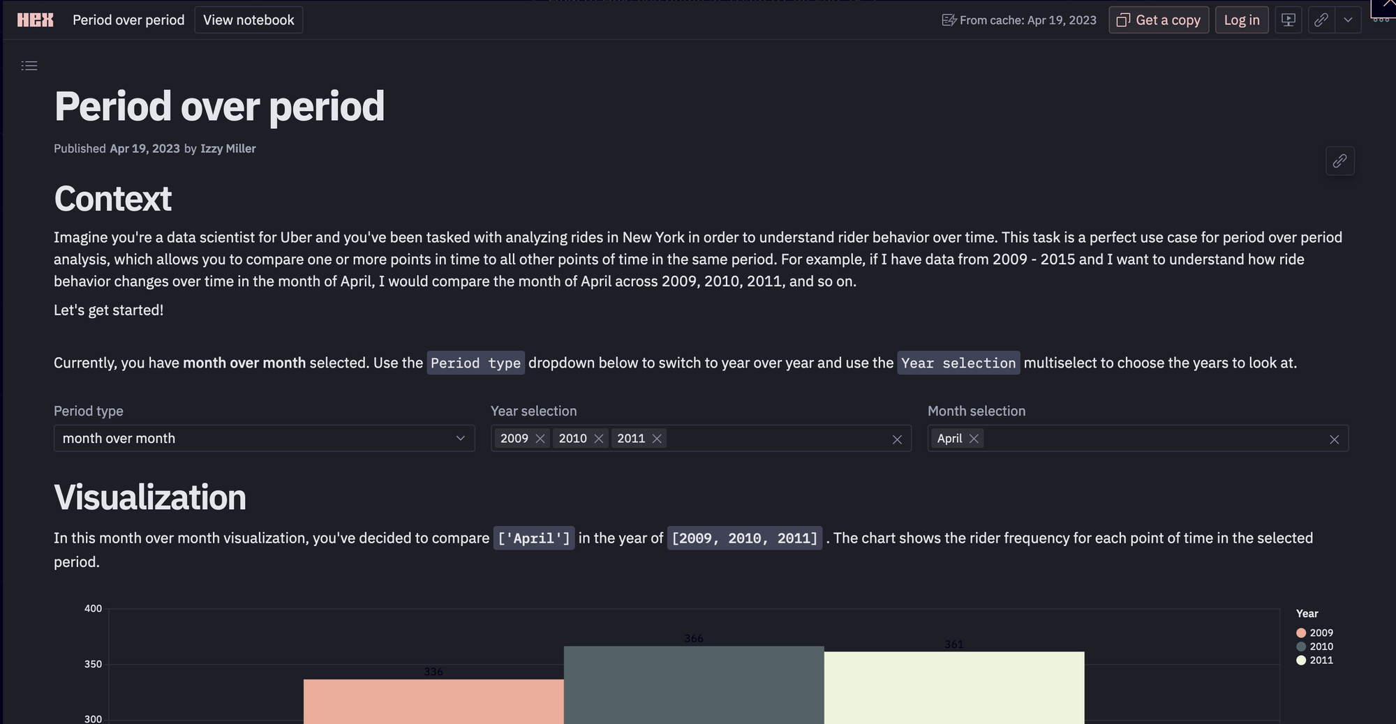 Let us set the context first, Imagine you're a data scientist for Uber and you've been tasked with analyzing rides in New York in order to understand rider behavior over time. This task is a perfect use case for period-over-period analysis, which allows you to compare one or more points in time to all other points of time in the same period. For example, if I have data from 2009 - 2015 and I want to understand how ride behavior changes over time in the month of April, I would compare the month of April across 2009, 2010, 2011, and so on.