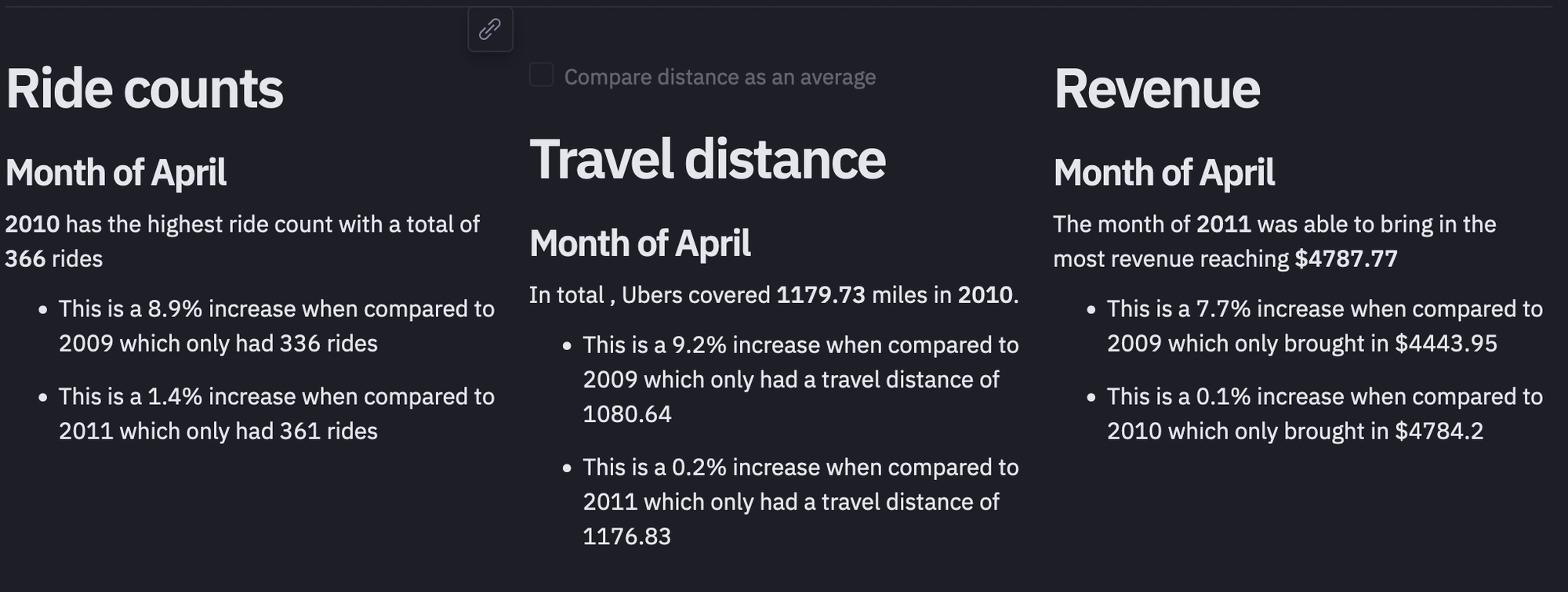 {% if use_avg_distance %} On average {% else %} In total {% endif %}, Ubers covered **{{travel_total[month]['value']}}** miles in **{{travel_total[month]['best_year']}}**. {% for stats in travel_total[month]['compared_to_other_years'] %}* This is a {{stats['percent']}}% increase when compared to {{stats['year']}} which only had a travel distance of {{stats['period_total']}}