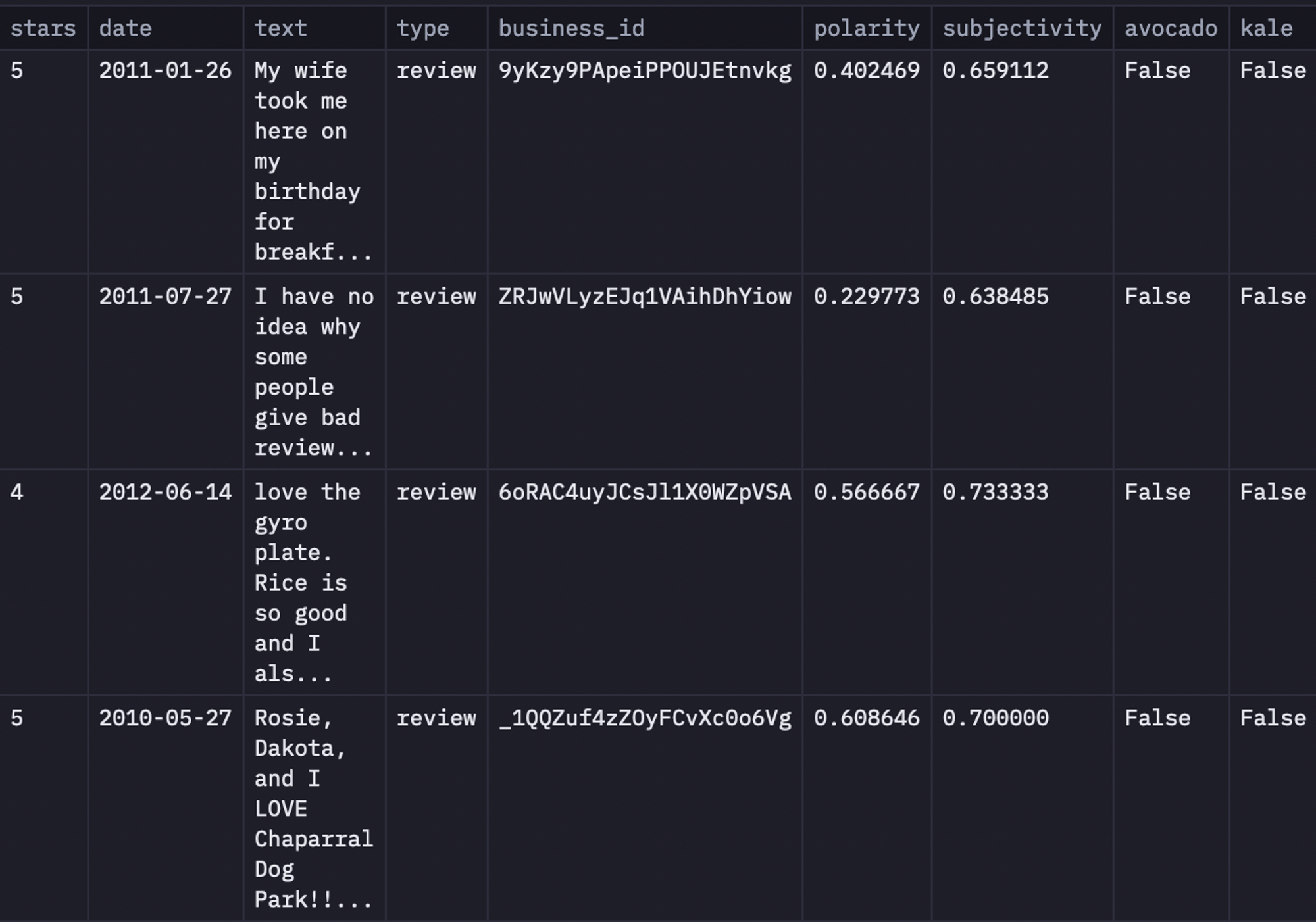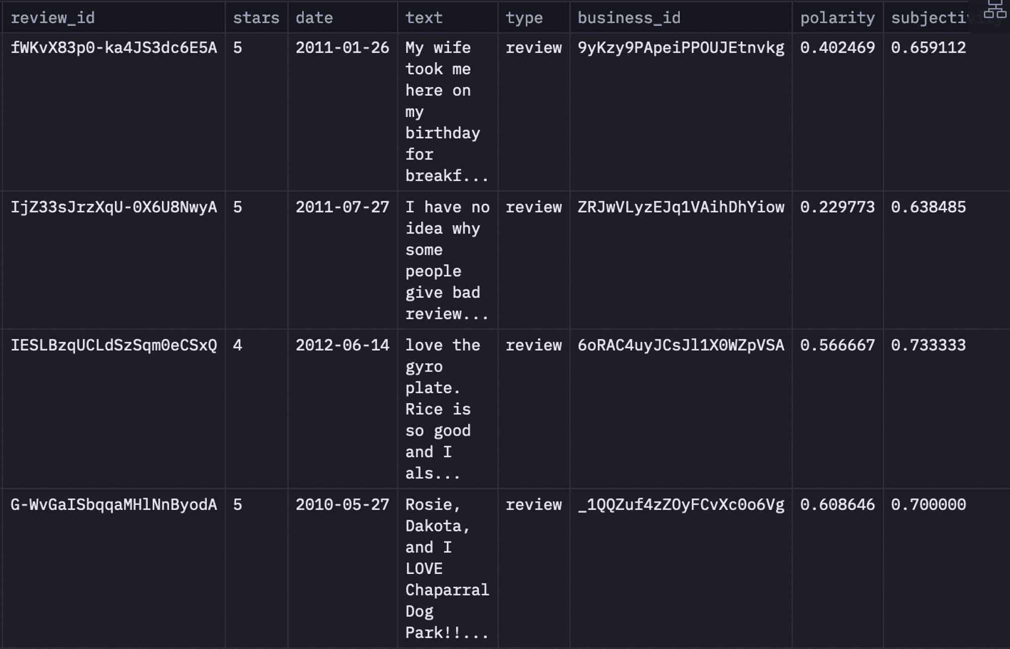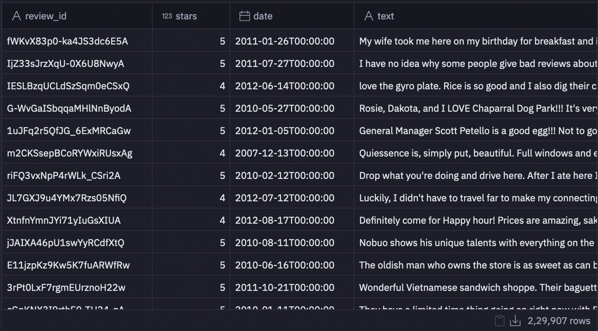 As you can see in the above image, the dataset consists of columns like review_id, stars, date, text, and so on.