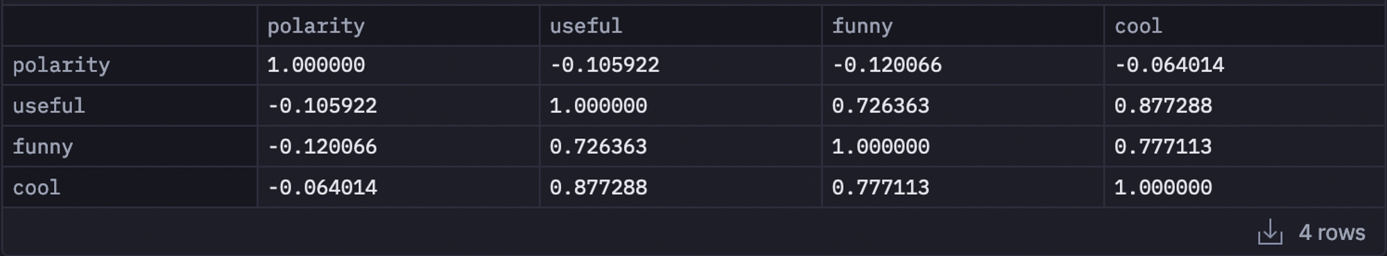 Finally, we'll quickly look at the reviews-of-reviews given by other readers on whether a review was useful, funny, or cool. Do these correlate to sentimentโ or to one another? To do so, you can simply use the corr() method to calculate the correlation among features like polarity, useful, funny, and cool.