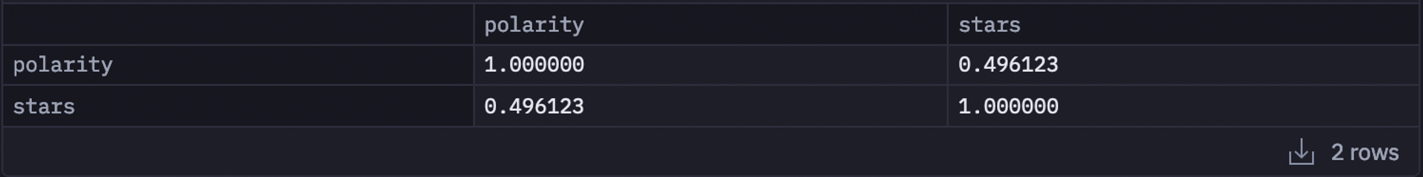 Similarly, You can also calculate the correlation between polarity and stars features as follows: