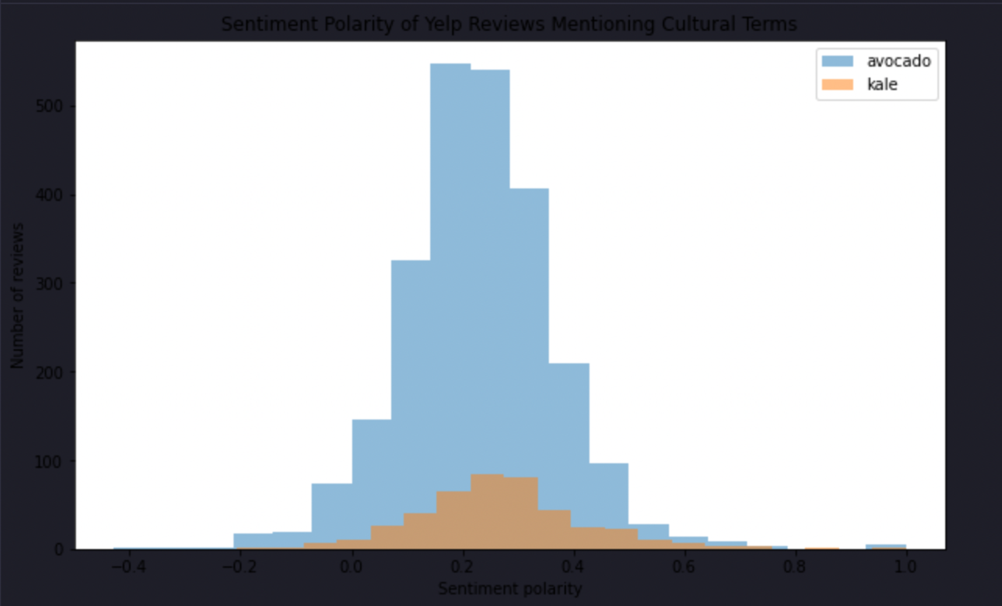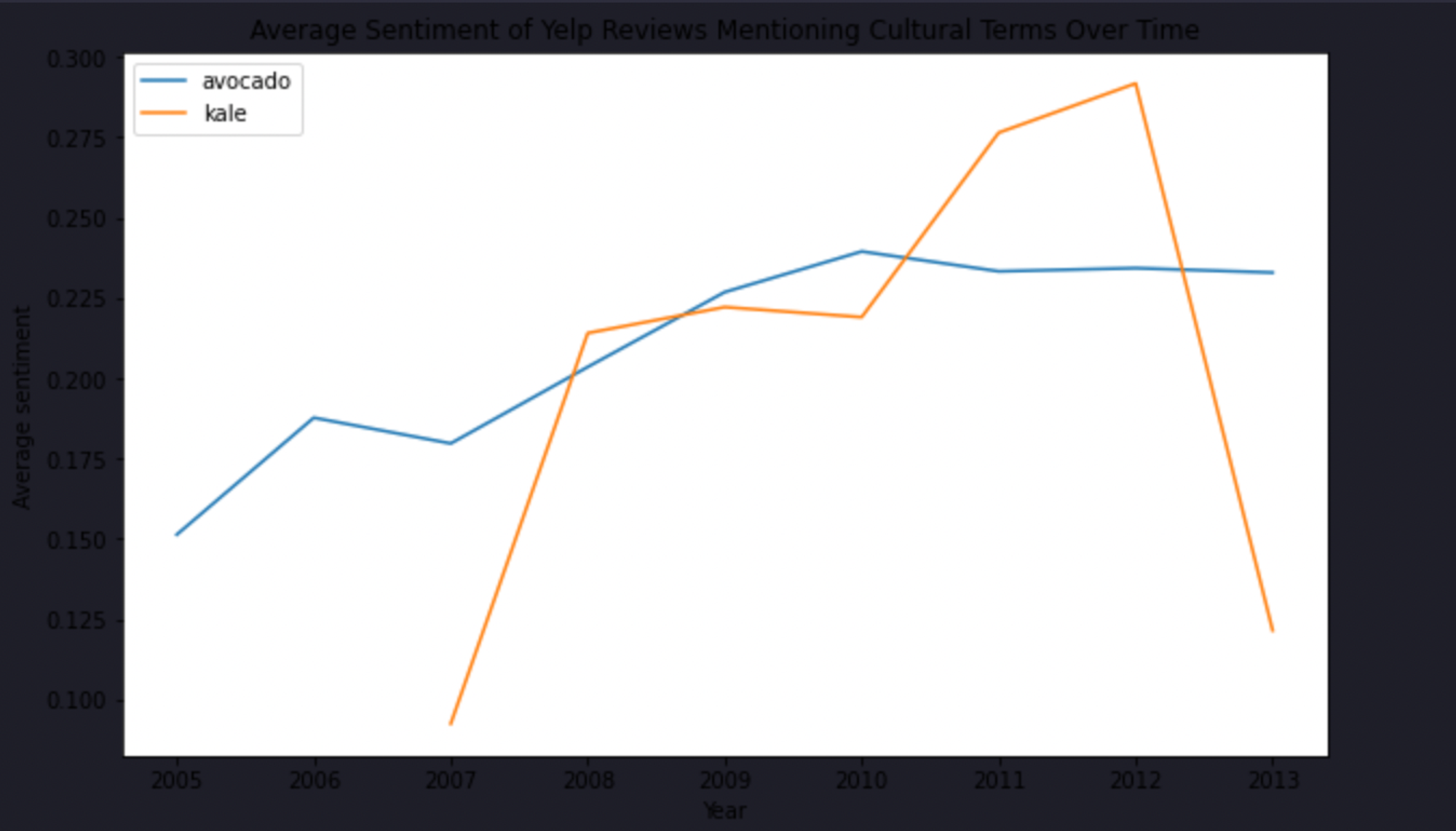 As you can see, the sentiment of the reviews containing the term avocado is increasing with time while with the kale term, it is decreasing.